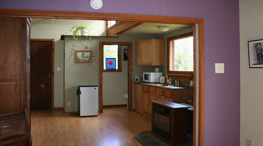 ![]() The kitchen-living area and small bath with toilet and shower are viewed from the bedroom. The entry to the bedroom is partially partitioned by an armoire that faces the living area. A matching armoire supplies closet and storage space in the bedroom. The kitchen-living area has a microwave oven, a small refrigerator and a wood-burning stove. In addition to the wood-burning stove, an electric Amish heater can be moved from one area to another. |