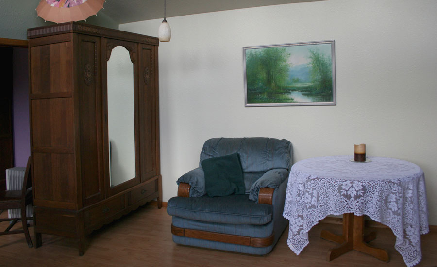 The cabin's rear wall opposite the kitchen area. An armoire that matches that in the bedroom helps to separate the general living area from the bedroom to the left.